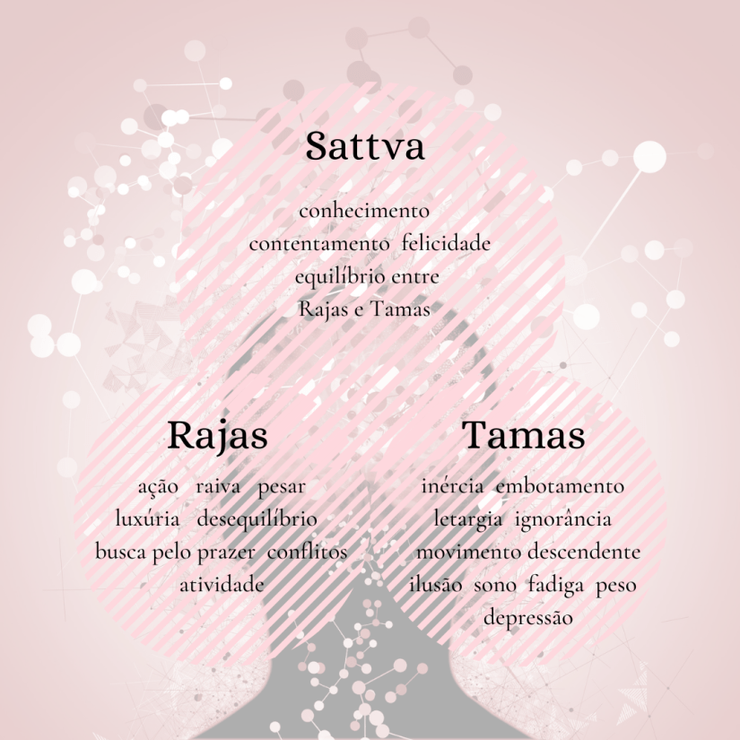 - Sattva: nem quente, nem frio, nem úmido, nem seco, leve, sutil, móvel, incisivo, macio, suave, límpido.