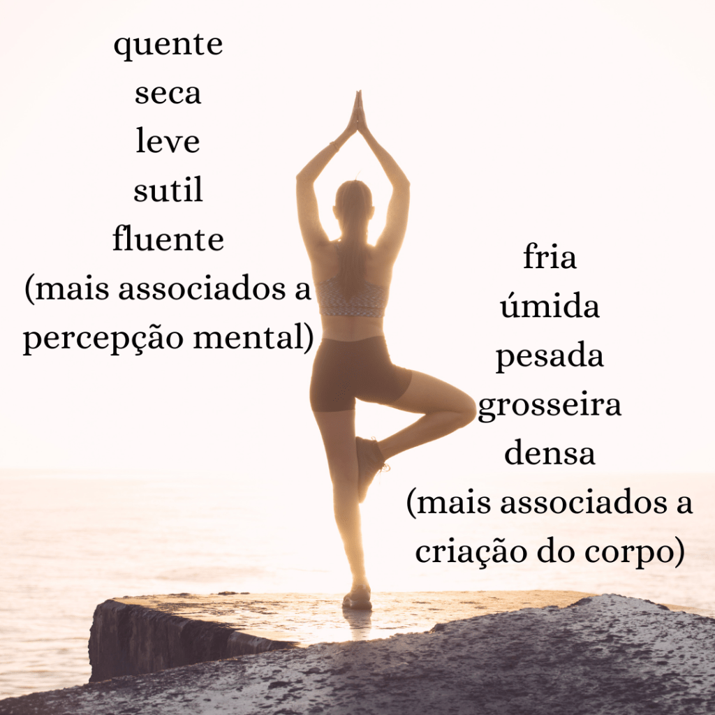 - Vata: frio, leve, seco, sutil, móvel, incisivo, duro, áspero, límpido